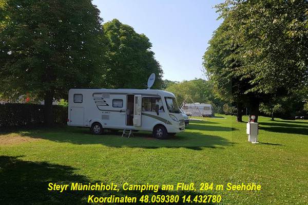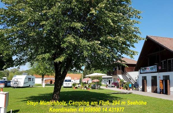 E14.43278°, neben der Enns Pauschalpreis für Wohnmobil und 2 Personen, VE und Strom 24,50 Euro |