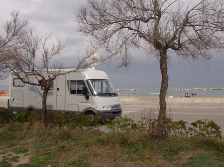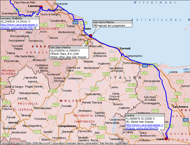 Auf der Fahrt von Lanciano nach Lucera rasten wir in San Solvo Marina am Lungomare, wo es auch einen schönen Stellplatz gibt, der im Winter aber nur zum Nächtigen ohne Wasser dient.
