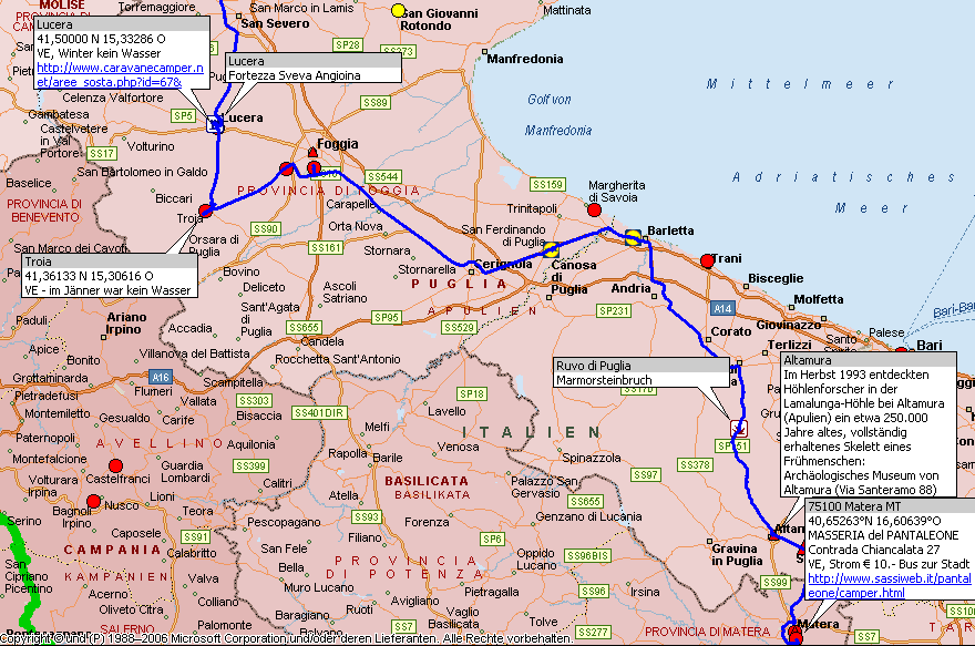 Genauso geht es uns in Foggia, der erste Stellplatz gleicht mehr einem Schrottplatz für LKW, der andere Stellplatz beim Flughafen Gino Lisa existiert nicht bzw. ist unauffindbar. Da Foggia eine Großstadt ohne attraktive Sehenswürdigkeiten ist setzen wir unsere Reise in Richtung Altamura fort.