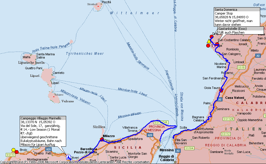 Nach einer ruhigen Nacht in Santa Domenica fahren wir die Küstenstraße entlang bis Villa San Giovanni, von wo wir mit der Fähre nach Messina in Sizilien übersetzen.
